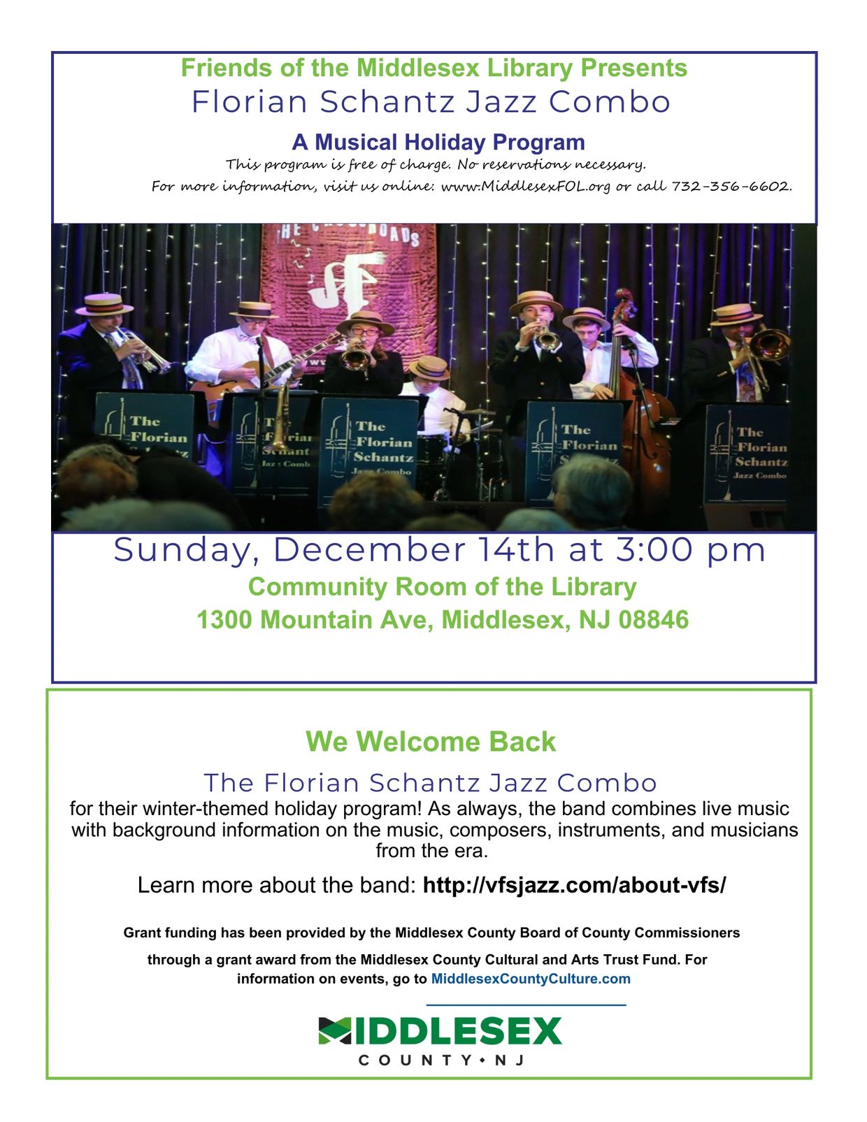 Grant funding for this program has been provided by the Middlesex County Board of County Commissioners through a grant award fro the Middlesex County Cultural and Arts Trust Fund. For information on events, go to MiddlesexCountyCulture.com