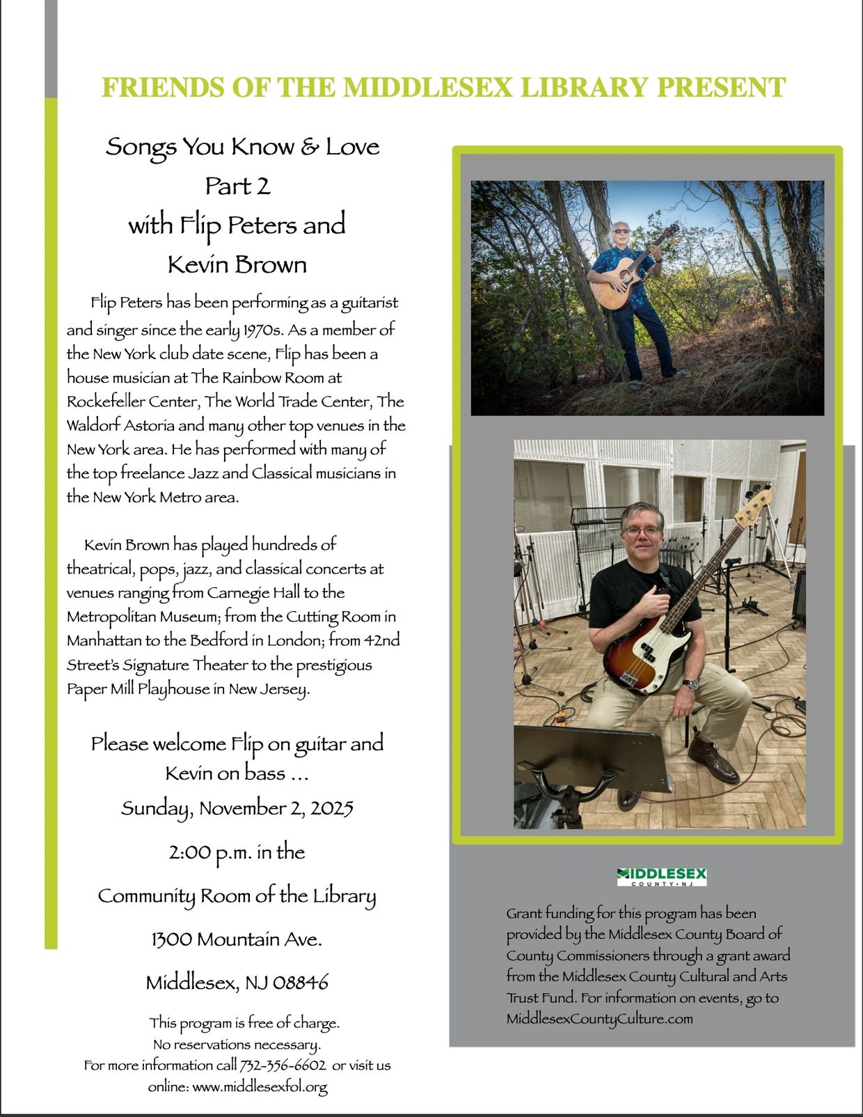Grant funding for this program has been provided by the Middlesex County Board of County Commissioners through a grant award from the Middlesex County Cultural and Arts Trust Fund. For information on events, go to MiddlesexCountyCulture.com